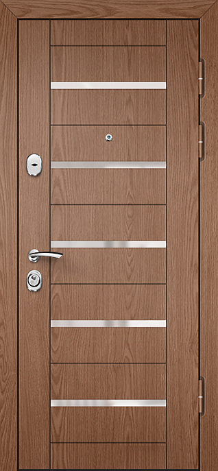 Входная дверь с зеркальным полотном №53 выделяется тем, что зеркало занимает почти всю внутреннюю поверхность, превращая дверь не просто в защитный элемент, а в полноценную часть интерьера. Такое решение особенно удобно для квартир и офисов, где зеркало необходимо ежедневно, а отдельное место для него найти непросто. Каркас изготовлен из профильной трубы и усилен рёбрами жёсткости, стальной лист толщиной 2 мм обеспечивает прочность и устойчивость к нагрузкам. В отделке использованы панели МДФ с ПВХ-покрытием, которые стойко переносят повседневные испытания и сохраняют внешний вид долгие годы. Два контура уплотнения защищают от сквозняков и уличного шума, а возможность выбрать размеры и направление открывания позволяет адаптировать модель для частных домов и городских квартир. Входная дверь с зеркальным полотном №53 от производителя: быстрое изготовление и монтаж в Дедовске, индивидуальные размеры, широкий выбор материалов и фурнитуры, официальная гарантия до 10 лет.